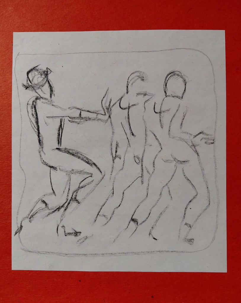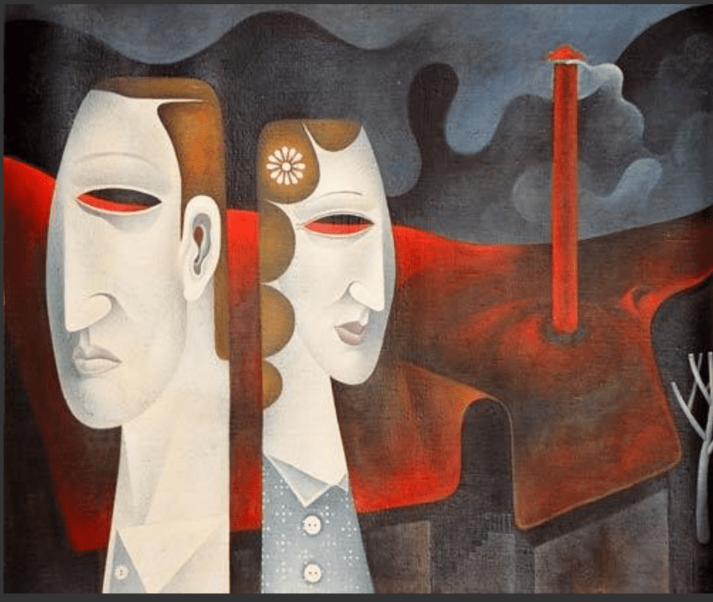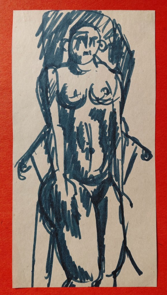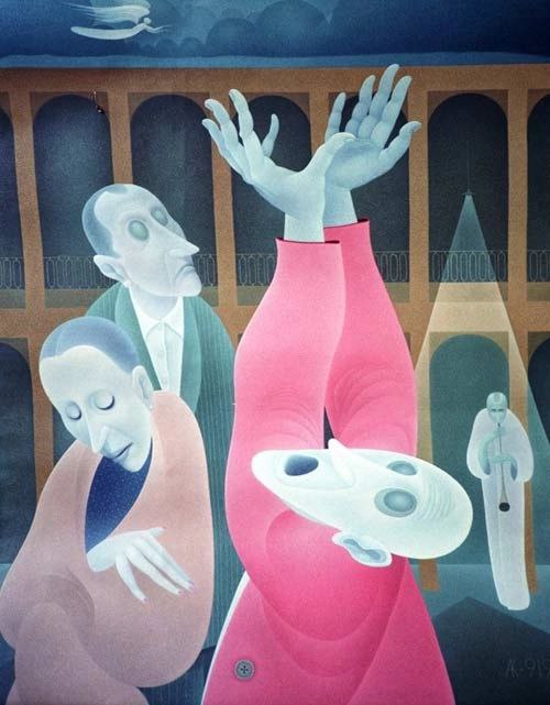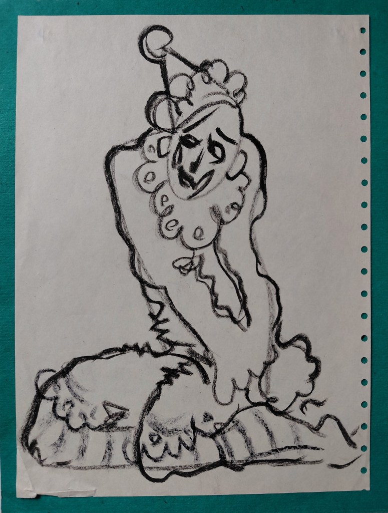 Эта картина в грубой раме, сколоченной в незапамятные времена Эдом из обломков петербургской мебели, висит у нас на стене, и мне не надоедает на нее смотреть. На обороте подпись: «А. В. Коломенков. Мим с красной шляпой. 1976. Ленинград. ХМ. 34Х60.» И дарственная надпись — » Дорогому Эдику на добрую память от автора. 1979.» По-видимому, подарок на 40летие…