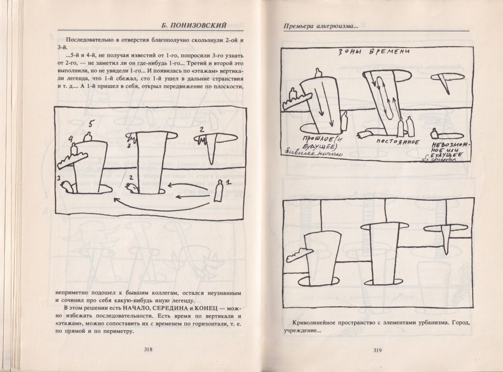 …5-й и 4-й, не получая известий от 1-го, попросили 3-го узнать от 2-го, — не заметил ли он где-нибудь 1-го… Третий и второй это выполнили, но не увидели 1-го… И появилась по этажам вертикали легенда, что 1-й сбежал, сто 1-й ушел в дальние странствия и т. д…. А 1-й пришел в себя, открыл передвижение по плоскости,