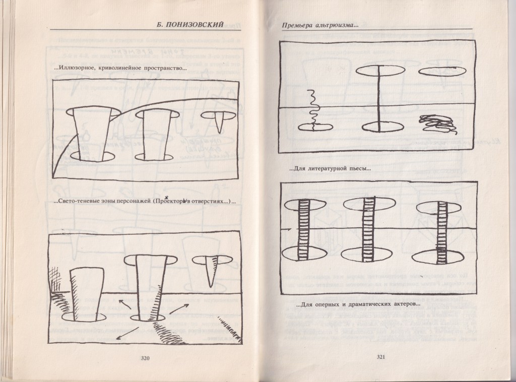 (Середина сцены — белый угольник с кулисными разрезами — имеет свою ценность, которую здесь лишне объяснять… Одна из схем этого механизма принята в нашем театре для постановки в 1981 г. «Ромео и Джульетта»)
