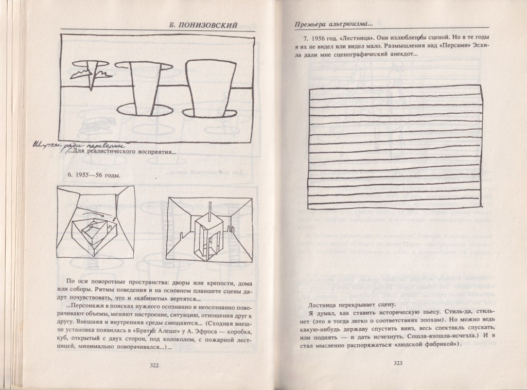 …Персонажи в поисках нужного осознанно и неосознанно поворачивают объемы, меняют настроение, ситуацию, отношения друг к другу. Внешняя и внутренняя среды смещаются… (Сходная внешне установка появилась в «Брате Алеше» у А. Эфроса — коробка, куб, открытый с двух сторон, под колоколом, с пожарной лестницей, минимально поворачивался…)…