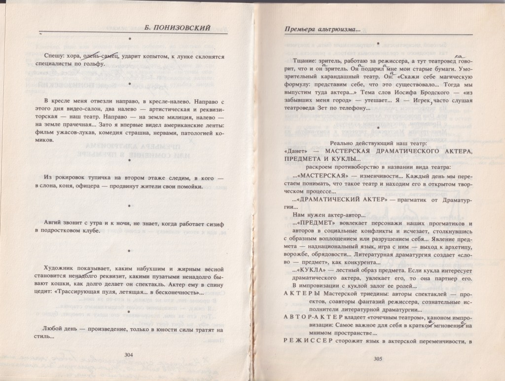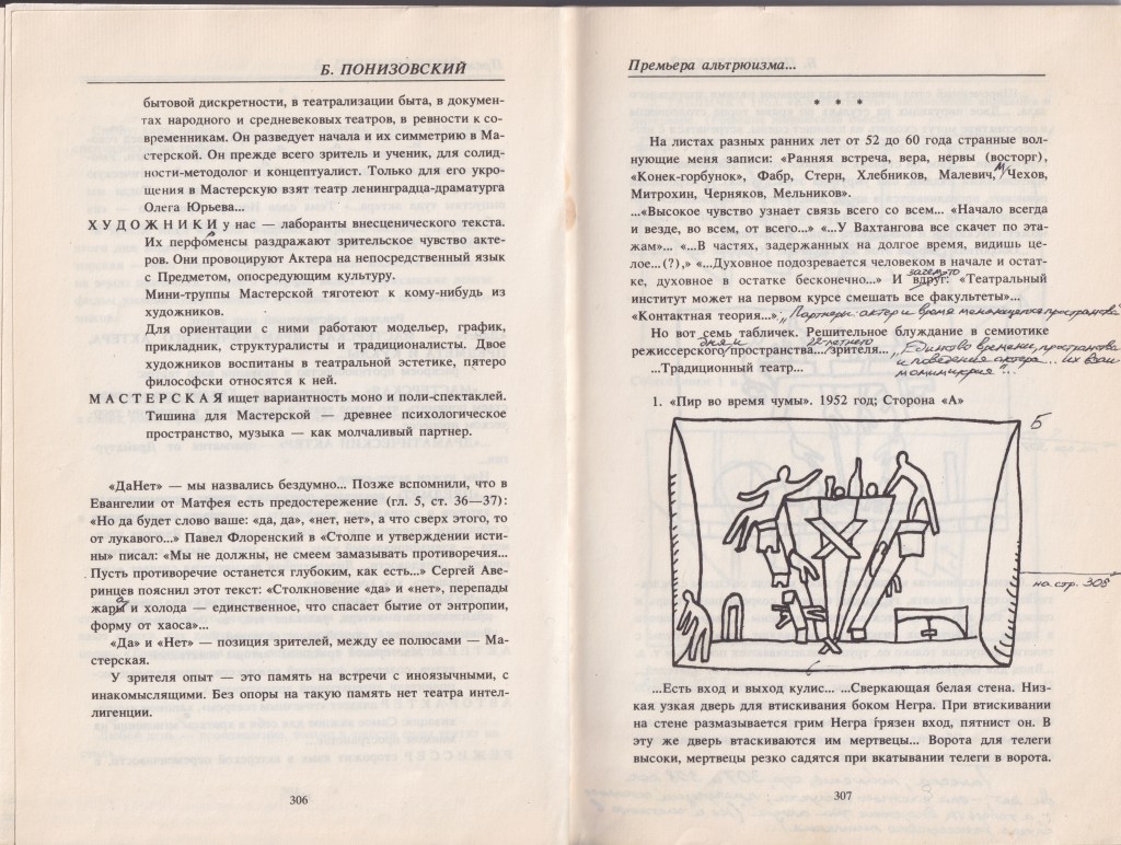 Р Е Ж И С С Е Р сторожит язык в актерской переменчивости, в (стр 306) бытовой дискретности, в театрализации быта, в документах народного и средневековых театров, в ревности к современникам. Он разведует начала и их симметрию в Мастерской. Он прежде всего зритель и ученик, для солидности-методолог и концептуалист. Только для его укрощения в Мастерскую взят театр ленинградца-драматурга Олега Юрьева…