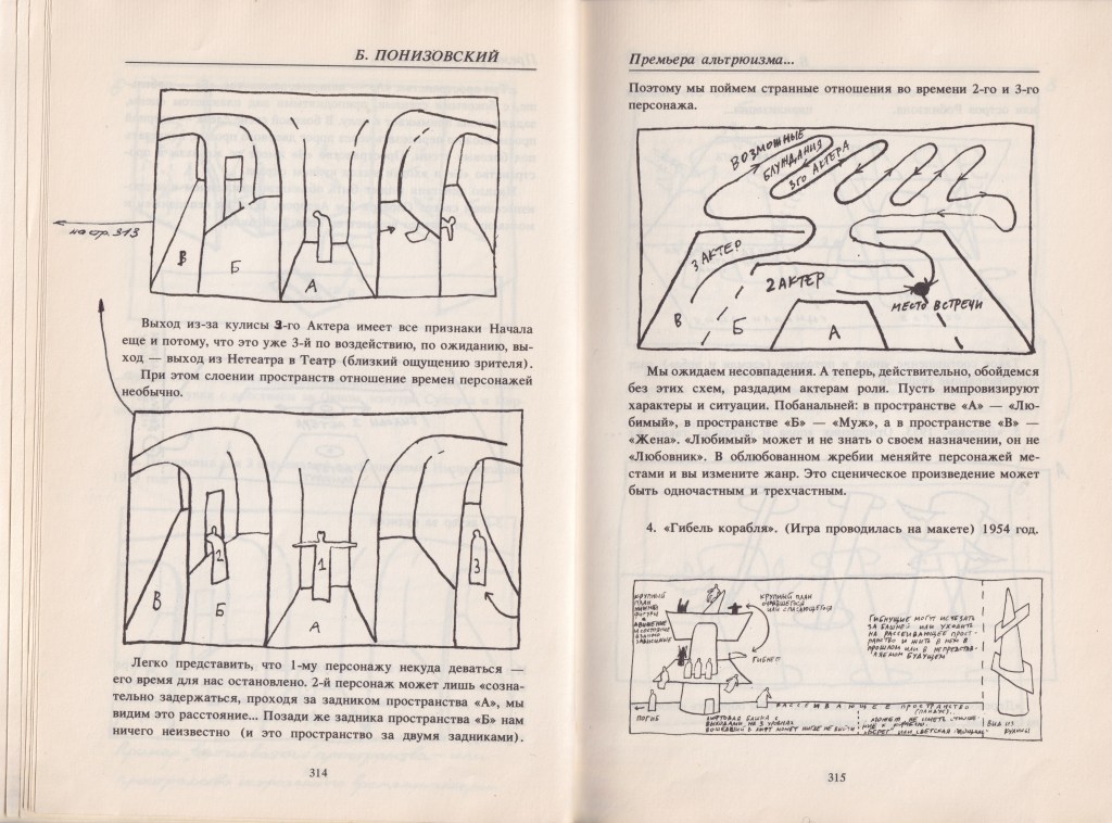 Мы ожидаем несовпадения. А теперь, действительно, обойдемся без этих схем, раздадем актерам роли. Пусть импровизируют характеры и ситуации. Побанальней: в пространстве «А» — «Любимый» , в пространстве «Б» — «Муж» , а в пространстве «В» — «Жена» . «Любимый» может и не знать о своем назначении, он не «Любовник» . В облюбованном жребии меняйте персонажей местами и вы измените жанр. Это сценическое произведение может быть одночастным и трехчастным.