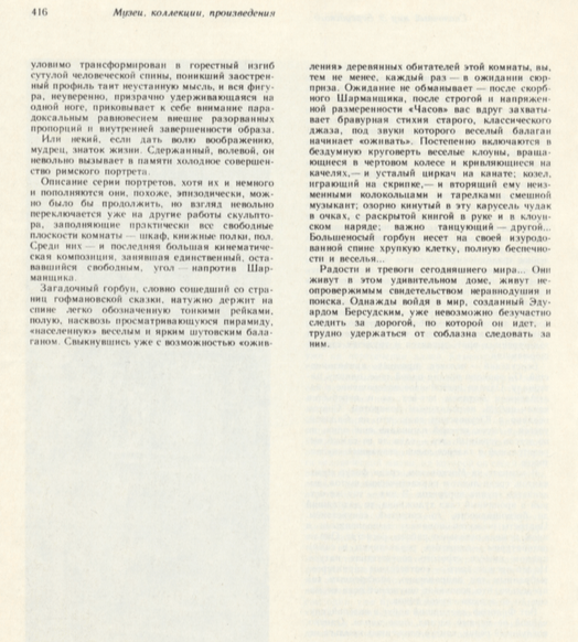 Но кто возьмет его под крыло? Кто позаботится о том, чтобы создать ;ему условия для работы? Я задавала эти вопросы разным людям. Предложения тоже были разными: может, Театральный музей? Музей городской скульптуры. Кукольный театр, выставочный зал Союза художников (членом которого, кстати, Бсрсудский не является)? Я же представила себе другое.