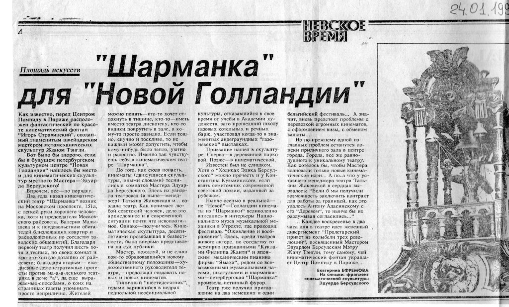 - Екатерина ЕФРЕМОВА. «Шарманка» для «Новой Голландии» — Невское время, 24/01/1992