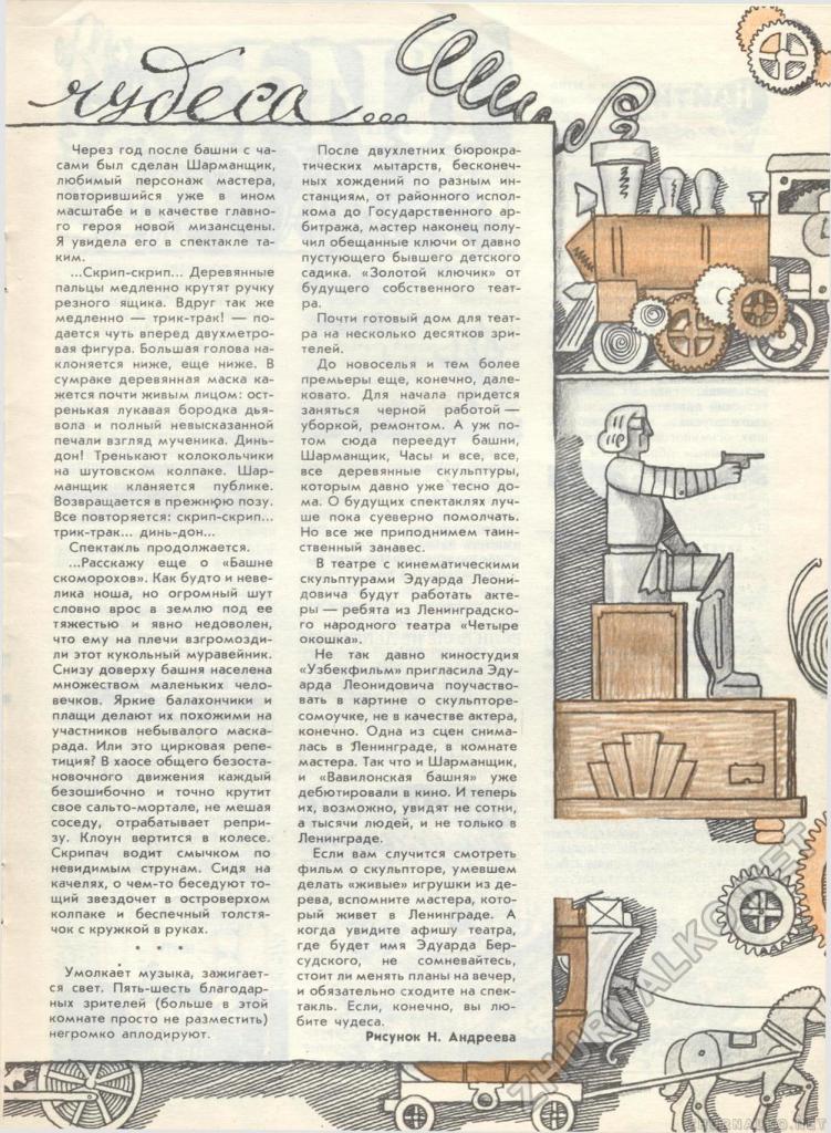 — Жил в Ленинграде самый обыкновенный человек Эдуард Леонидович Берсудский (о нем, кстати, «ЛР» писал неоднократно). Специального образования не имел и долго не мог найти себя: работал шкипером, слесарем, кочегаром… И с детства любил вырезать из дереза разные фигурки. Постепенно увлечение стало приобретать черты серьезного творчества, в 30 лет Берсудский занялся деревянной скульптурой. Может быть, вы видели деревянных зверей, сказочных персонажей в Михайловском саду, на Каменном острове? Их сделал Эдуард Леонидович, когда работал в городском садово-парковом хозяйстве. А потом… 11 скульптурных кинематических композиций мы случайно увидели в квартире Мастера, как все теперь его называют. «Так это же готовый театр, какого нет ни у нас, ни за рубежом! — невольно воскликнули. — Его обязательно должны видеть люди!..»