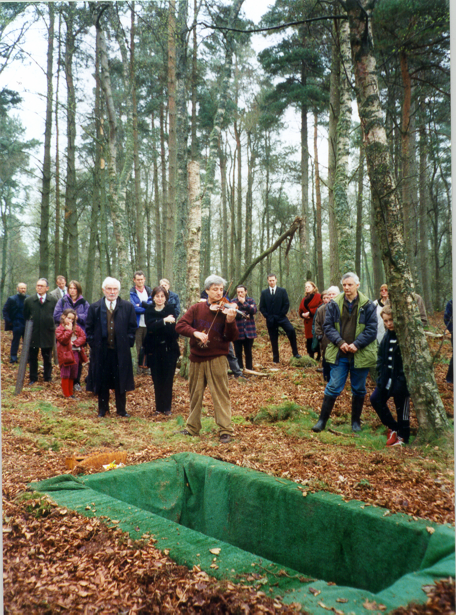 Потом Лева Атлас играл на скрипке ту музыку, которую он играл Тиму в больнице за день до смерти — Свиридов, Пушкинский Венок — а птицы подпевали оглушительным хором. Потом гроб опускали в сруб на белых канатах, и Эд так медлил опускать свой конец, что на него кто-то из братьев зашумел приглушенно — ровняй, дескать! (по английски, конечно — кто мог догадаться, что ближайший соратник на этом языке ни гу-гу !!!) Но обошлось — не уронили…Лева еще поиграл, все еще поревели — и пошли от могилы (ее тут зарывают позже…) Мари Григор — киношник, который снимал «Лицо России» и скоро начнет делать фильм про нашу Часовую башню — сказал: «Это все — уже фильм… Тарковский…»
