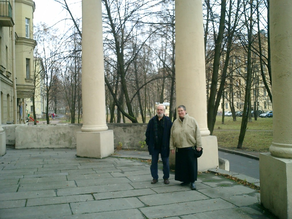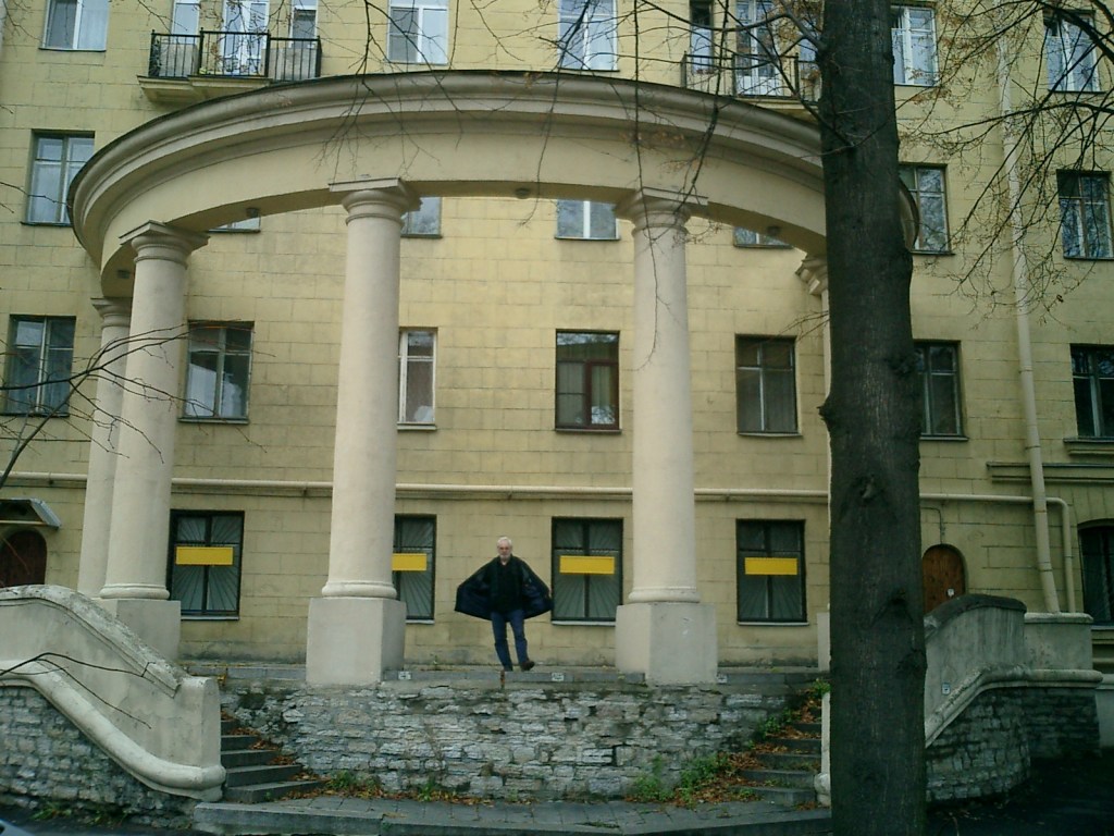 Абсурдная колоннада, хорошо видимая с Московского проспекта, просто просилась стать входом в театр – не заставлять же зрителей плутать по задворкам? Решили прорубить арку в стене между двумя большими комнатами, получится хорошее пространство для маленького театра: одна половина станет залом для кинематов, другая – зрительским фойе. Раз Горбачев провозгласил, что разрешено всё, что не запрещено, то нам и в голову не пришло спрашивать, можно ли. Мужики прикинули – судя по толщине, стена не несущая, стукнули по ней тяжёлым молотом – действительно, оказалась простая перегородка — и за день её тоже вынесли на балюстраду. Однажды кто-то сфотографировал нас с Эдом на этой груде строительного мусора – и каким-то чудом кадр сохранился.