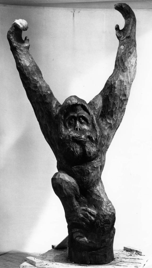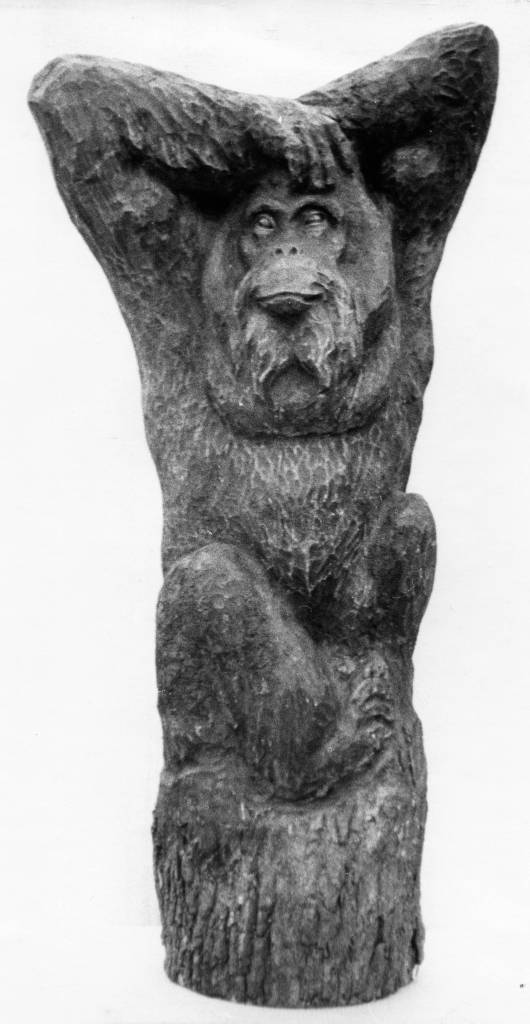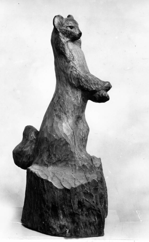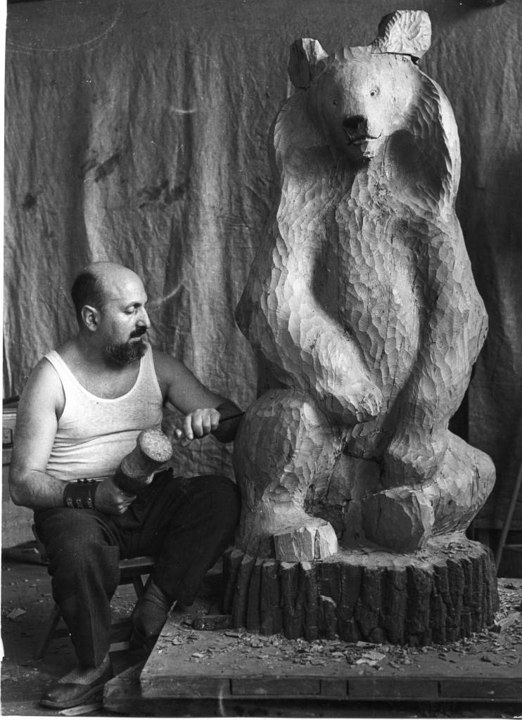 ЭБ: Я видел сам процесс. Я в первый раз видел, как из обыкновенного бревна делают медведя. К нему при мне привезли огромный дубовый пень, очень тяжёлый. Мы его туда закатывали, с большим трудом. А потом началось самое интересное для меня, потому что я видел, как постепенно из этого пня он освобождал медведя, убирая то, что лишнее. И вот в этом я ему помогал. Я брал кувалду…