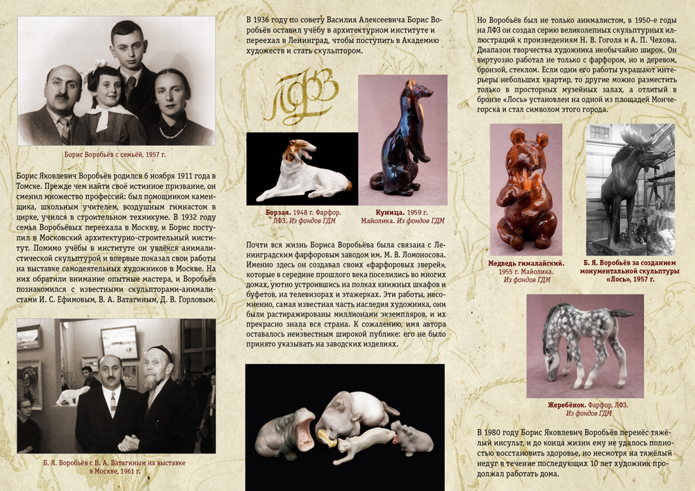 Почти вся жизнь Бориса Воробьёва была связана с Ленинградским фарфоровым заводом им. М. В. Ломоносова. Именно здесь он создавал своих «фарфоровых зверей», которые в середине прошлого века поселились во многих домах, уютно устроившись на полках книжных шкафов и буфетов, на телевизорах и этажерках. Эти работы, несомненно, самая известная часть наследия художника, они были растиражированы миллионами экземпляров, и их прекрасно знала вся страна. К сожалению, имя автора оставалось неизвестным широкой публике: его не было принято указывать на заводских изделиях. Но Воробьёв был не только анималистом, в 1950-е годы на ЛФЗ он создал серию великолепных скульптурных иллюстраций к произведениям Н. В. Гоголя и А. П. Чехова.