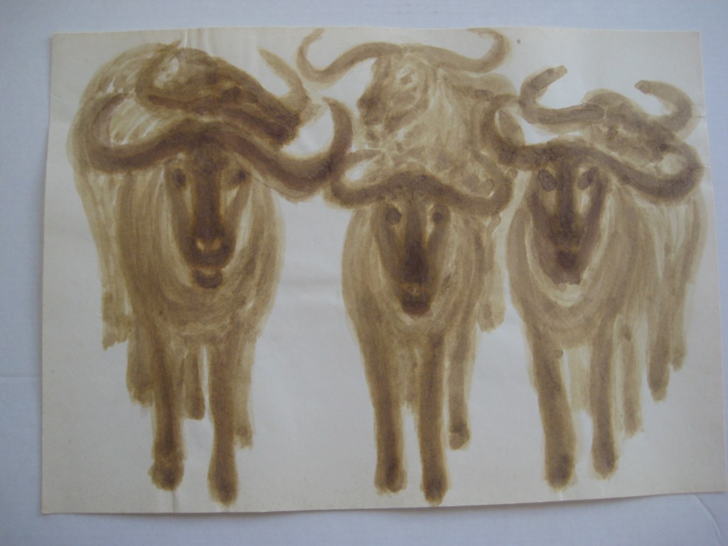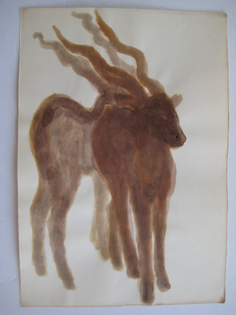 МВ: Это можно назвать акварелью, но вообще-то его красители, которыми он пользовался, когда окрашивал деревянную скульптуру, у него в банках были разведены эти красители. и он брал кисть, и я ему покупал несколько пачек бумаги. И это было главное его занятие…