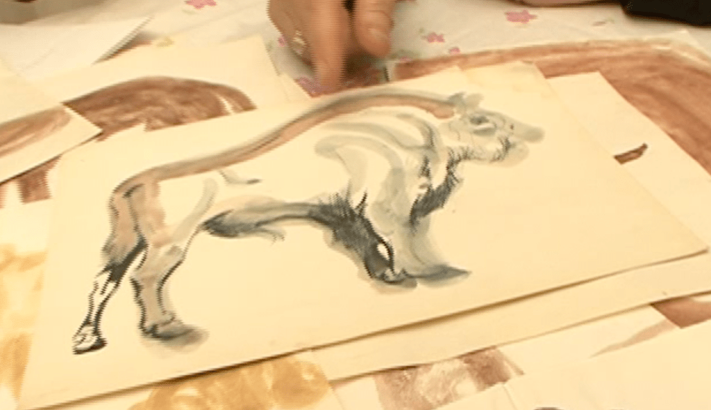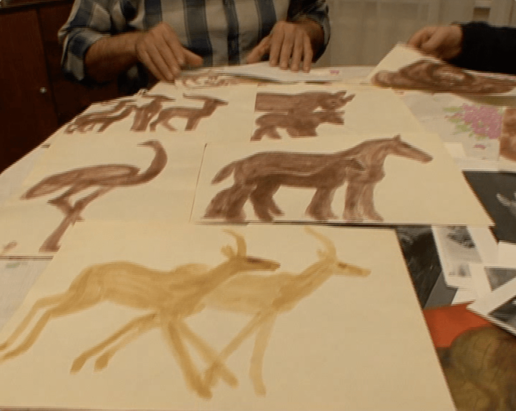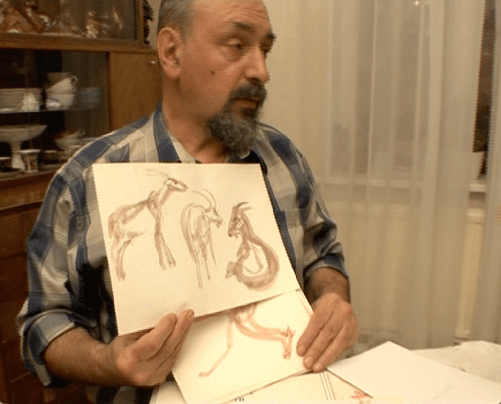 Потом он научился ходить и рисовать левой рукой. Правая рука была парализована. Говорить он не мог. Он ходил с моей помощью и с палочкой, а потом я его выкатывал на кресле-каталке. Но рисовал, покрывал стол сотнями рисунков, сотнями рисунков левой рукой. Писать он не мог, говорить он не мог, но резал по дереву понемножку, понемножку. Вот я вам покажу, одной рукой, бесконечные рисунки. И рисунков этих было очень много. Они были разного качества, некоторые из них совершенно необыкновенно выразительны.