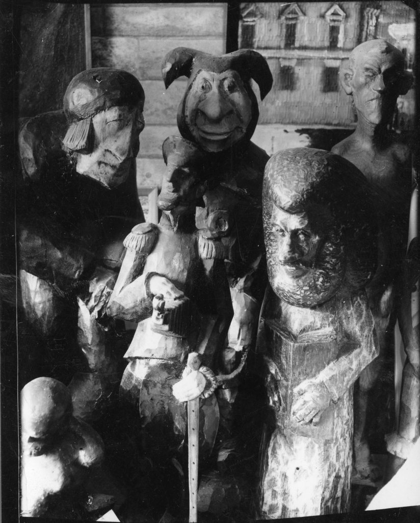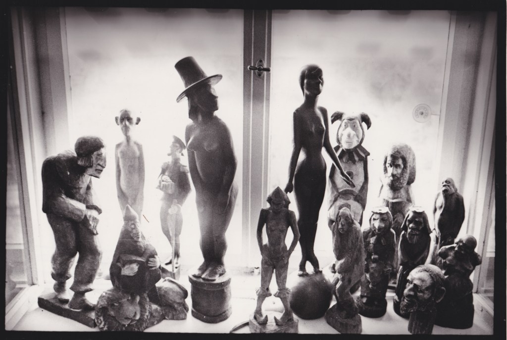 Выставки, инсталляции, костюмированные сборища устраивались в большой комнате у Гоголицына, а в распоряжении Эда была узкая комната примерно 12 квадратных метров — то есть вдвое больше, чем рабочее пространство на Свечном, и он разогнался — резал деревянную скульптуру одну за другой, и они становились всё интересней — уже не типажи, а характеры, персонажи пока ещё статичного театра.
