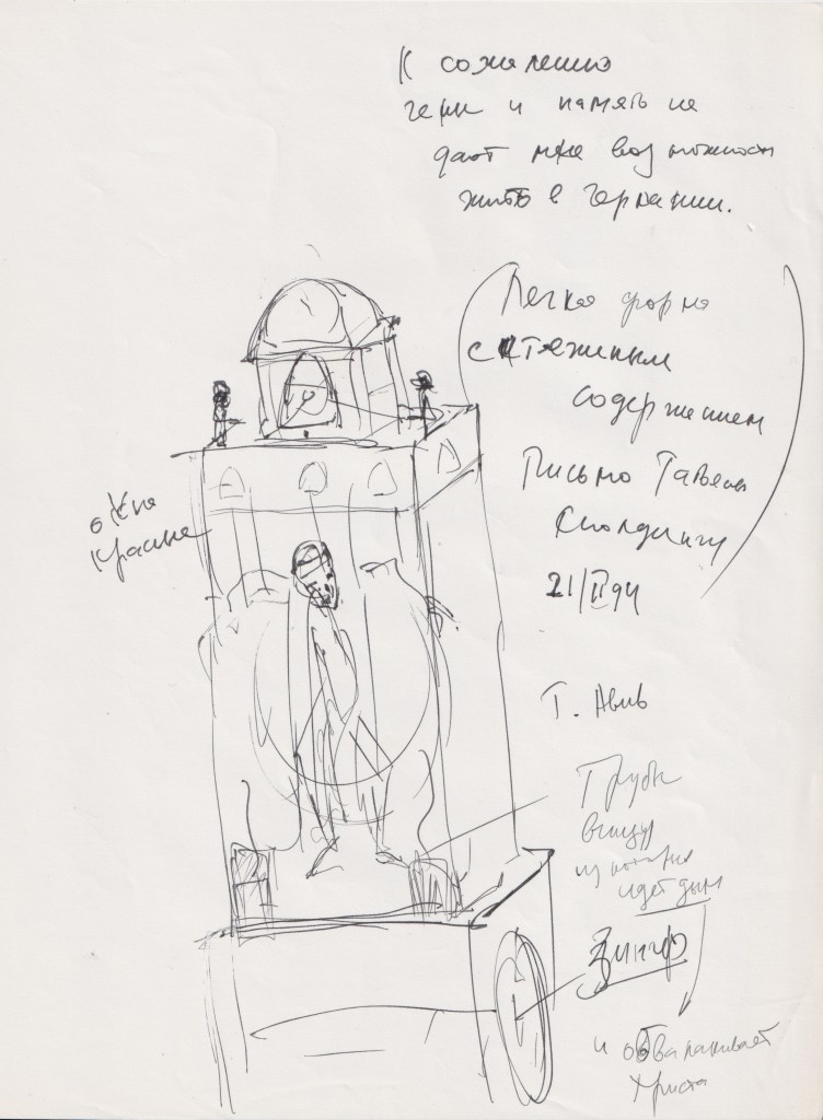 До того, как началась вся свистопляска с визами, мы думали, что Эд сможет подготовить для неё 4 новых кинемата. Готов был только один — «Шутки Джока», но за три недели, прошедшие с тех пор, как Эд вернулся из Израиля, он почти успел построить ещё один. Фигурка в кипе, распятая на цепях, двигается то ли в танце, то ли в ночном кошмаре, посреди угрожающих колёс и ржавого железа.