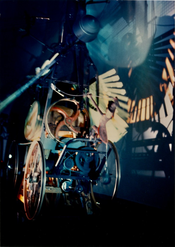 Постепенно персонажи занимали свои места на конструкции в бывшем коровнике. Вот тут уже появился рулевой, который крутит и руль, и педали, и женская фигура в самом низу, в котельной/кочегарке/машинном отделении, возможно — главная движущая сила всего сооружения. Она ещё и головой в колокол бьёт — зовет на помощь? не даёт забыться спокойным сном?