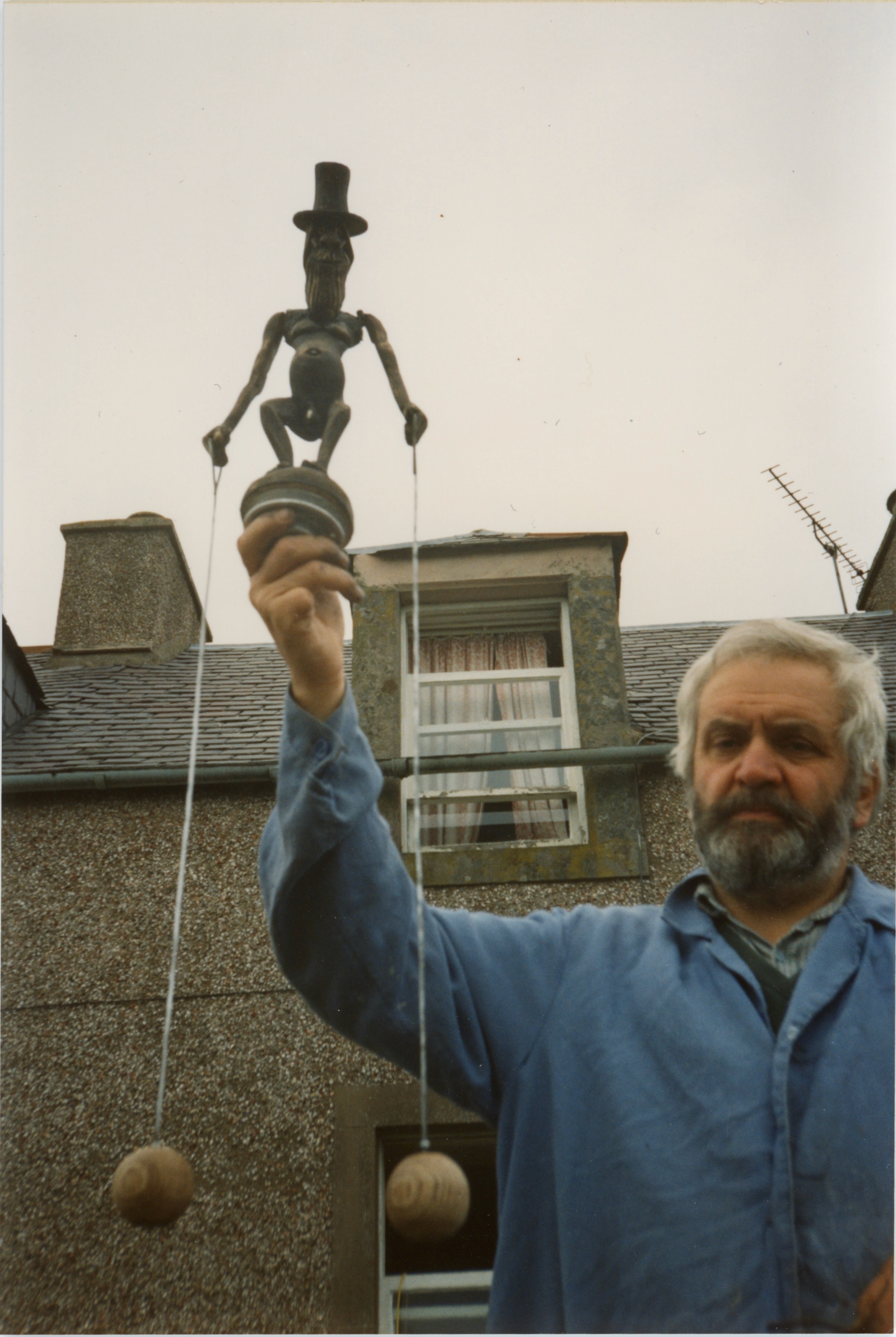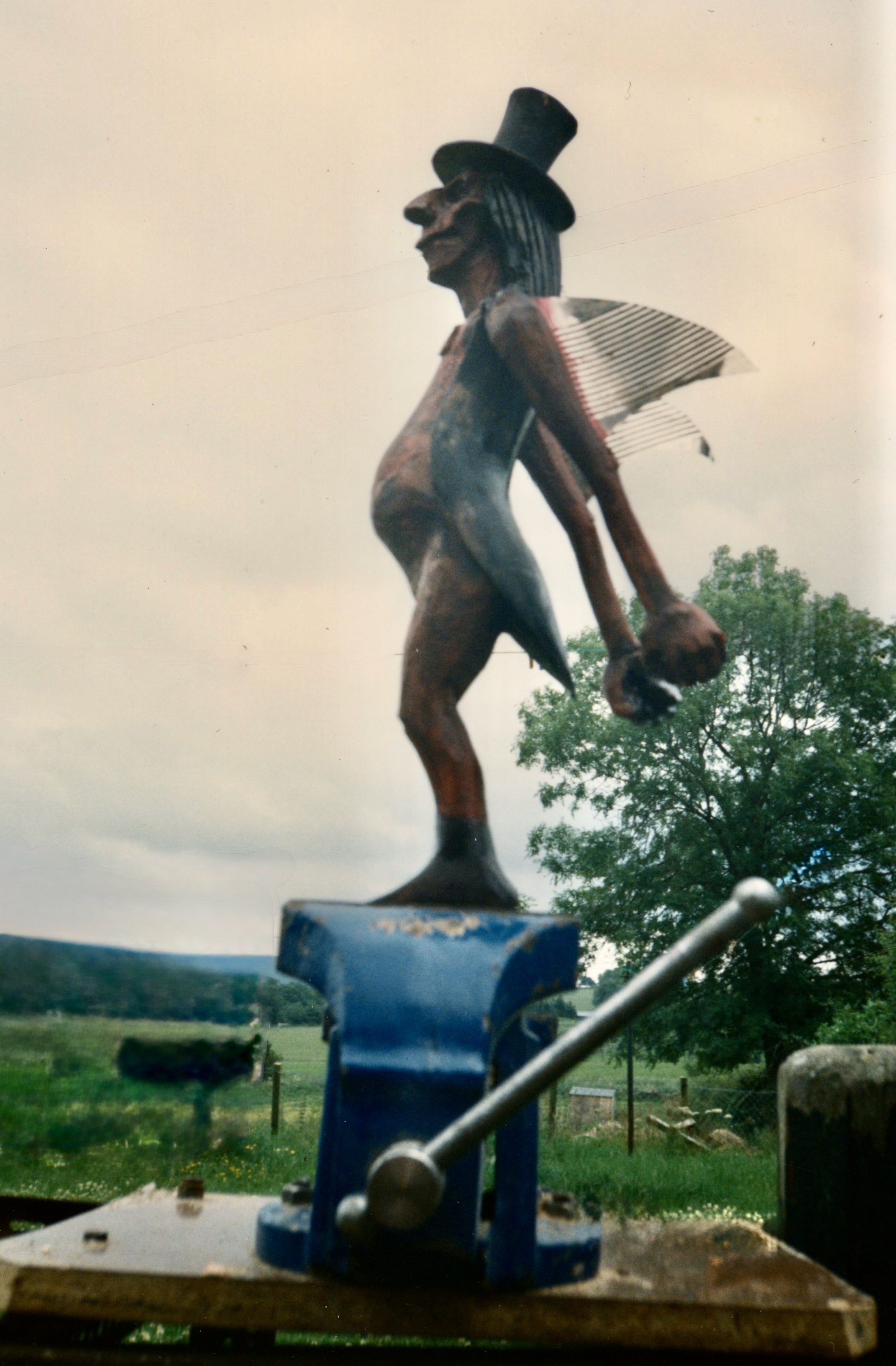 На другой свалке — у Джима на окраине соседнего городка Галашилс /Galashiels обнаружился ржавый тренировочный велосипед. Эд поставил его на дыбы и прикрутил к маслобойке, а с другой ее стороны приторочил старый потолочный вентилятор с тяжелыми лопастями — по-моему, нам кто-то подарил его в Лейпциге. На колоколе, который мы купили на барахолке (кажется, в Нирпельте) красовалась надпись «Титаник» («Что, настоящий?» — смеясь, спросили мы у продавца. «Да-да, не сомневайтесь, у меня ещё такие есть») На крылышки пошли пластмассовые жалюзи — тоже с галашилской свалки.