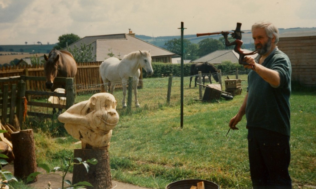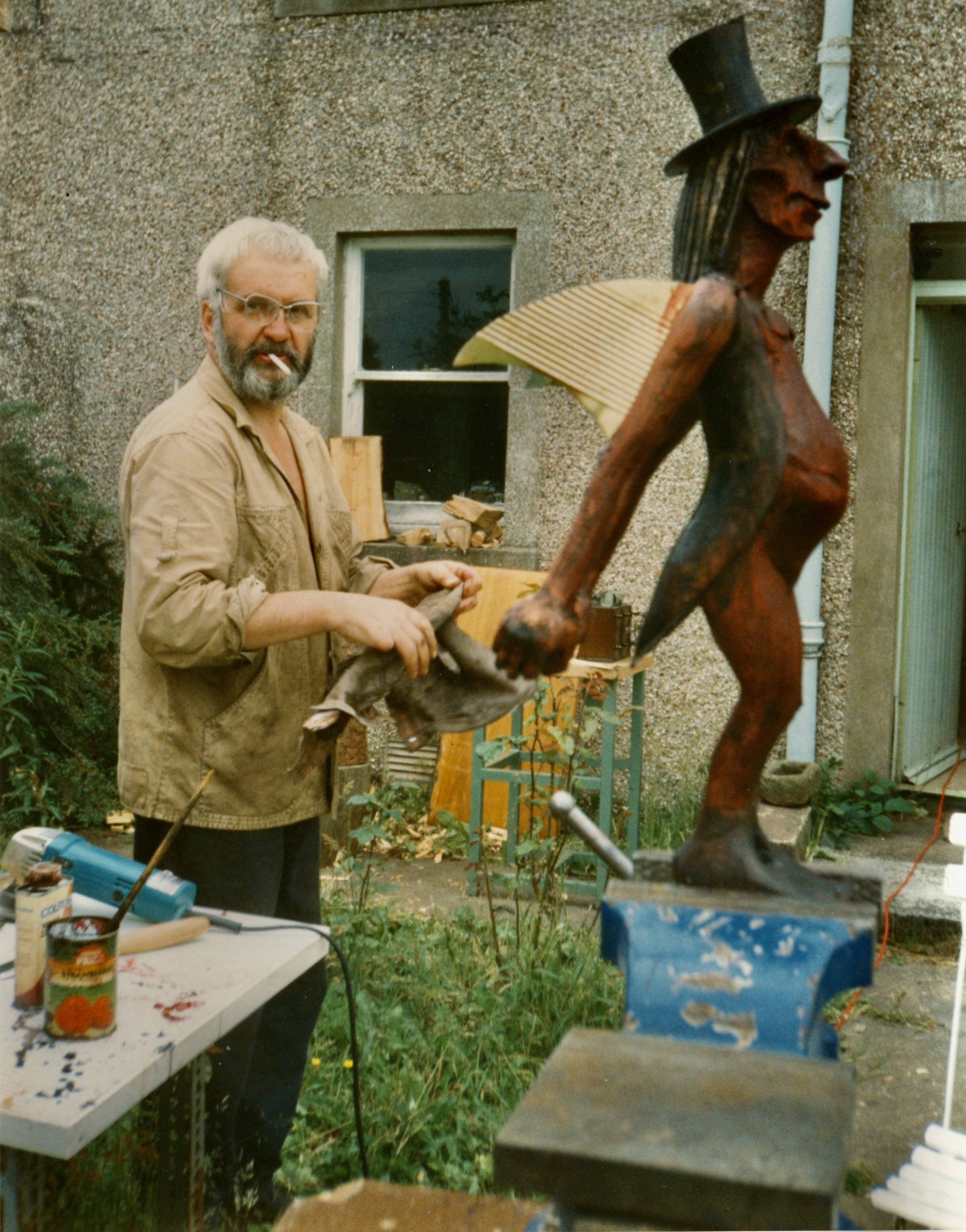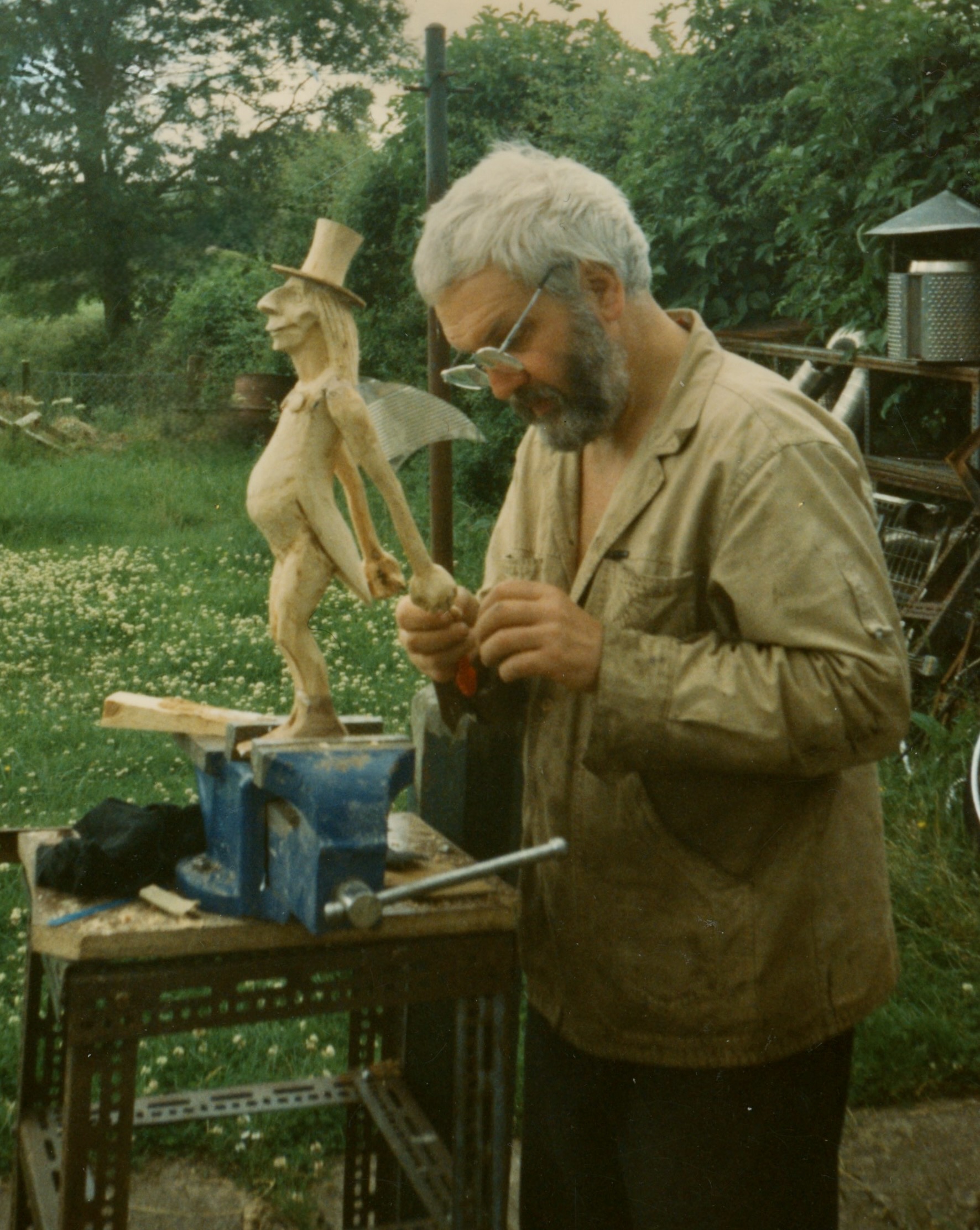 Лето стояло сухое и тёплое, и мастерская выплеснулась на полянку позади коттеджа. Дорвавшись до дерева и стамесок, Эд для разгона вырубил из старого пня улыбчивое создание, которое мы нарекли «Сёсикой», — в подарок Йетте Баккер.