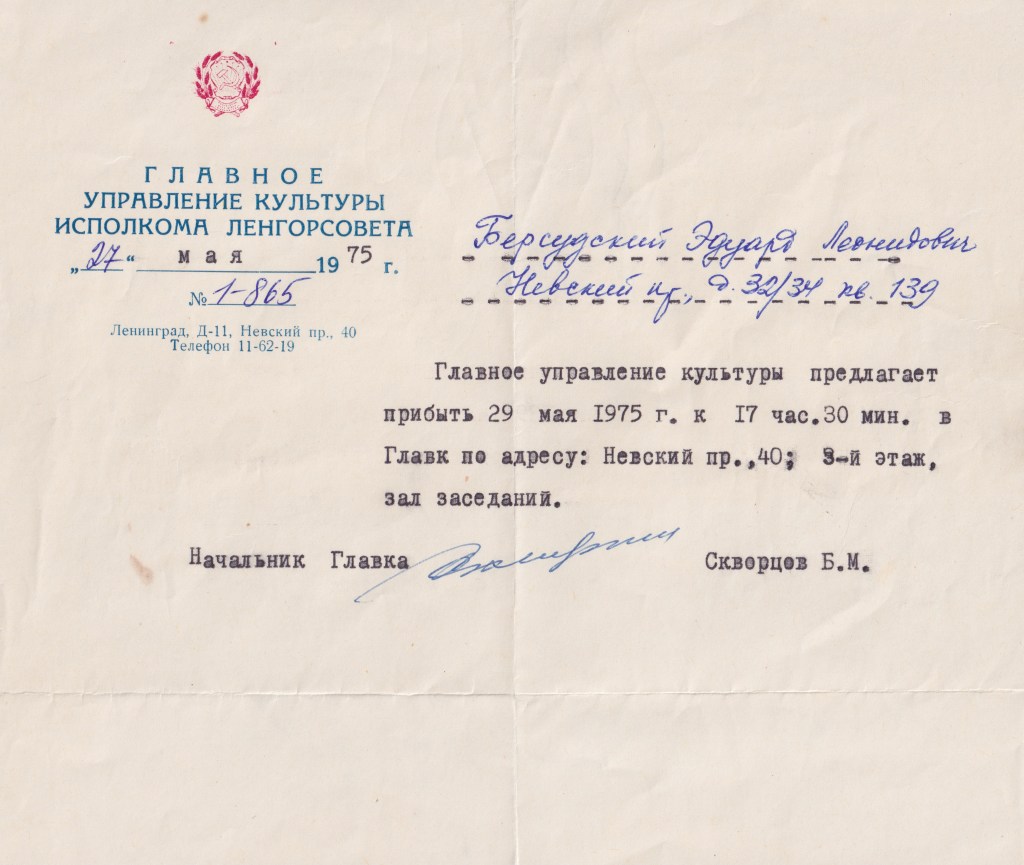В 1975 в центре внимания органов оказались художники. В мае Эд и Алевтина, как и все остальные участники неофициальных выставок, получили повестки из Управления культуры.