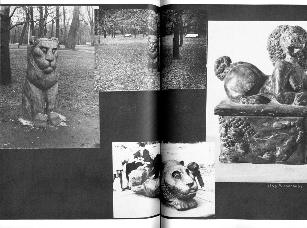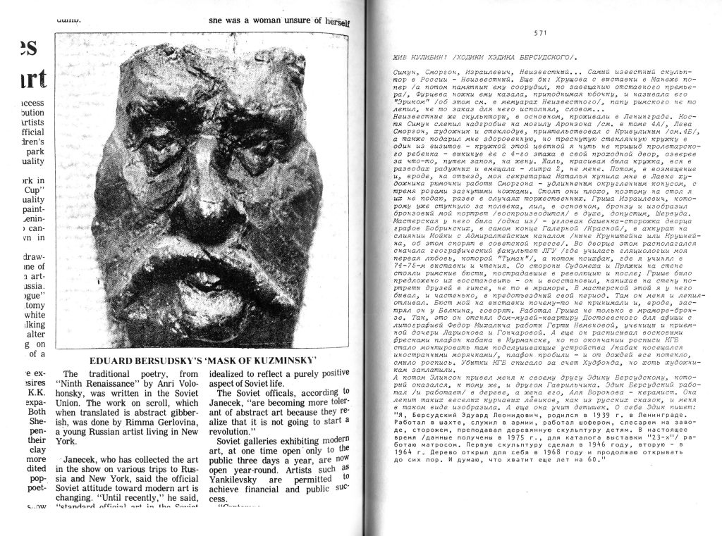 А потом Элинсон привел меня к своему другу Эдику Берсудскому, который оказался, к тому же, и другом Гаврильчика. Эдик Берсудский работал /и работает/ в дереве, а жена его, Аля Воронова — керамист. Она лепит таких веселых курчавых лёвиков, как из русских сказок, и меня в таком виде изобразила. А еще она учит детишек. О себе Эдик пишет: «Я, Берсудский Эдуард Леонидович, родился в 1939 г. в Ленинграде. Работал в шахте, служил в армии, работал шофером, слесарем на заводе, сторожем, преподавал деревянную скульптуру детям. В настоящее время /данные получены в 1975 г., для каталога выставки «23-х»/ работаю матросом. Первую скульптуру сделал в 1946 году, вторую — в 1964 г. Дерево открыл для себя в 1968 году и продолжаю открывать до сих пор. И думаю, что хватит еще лет на 60.»