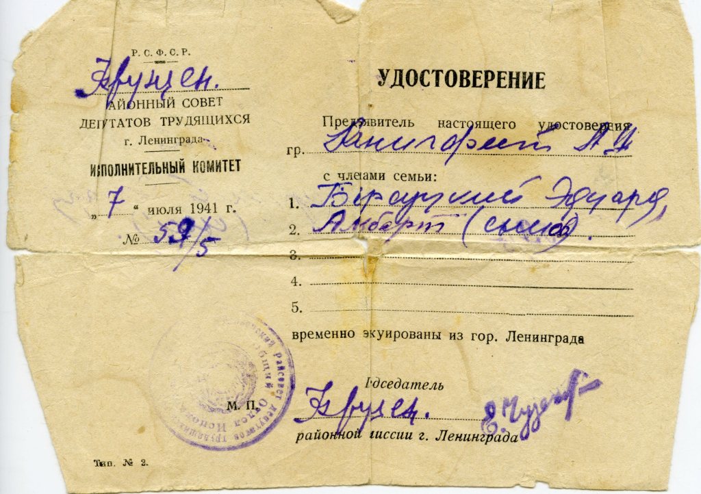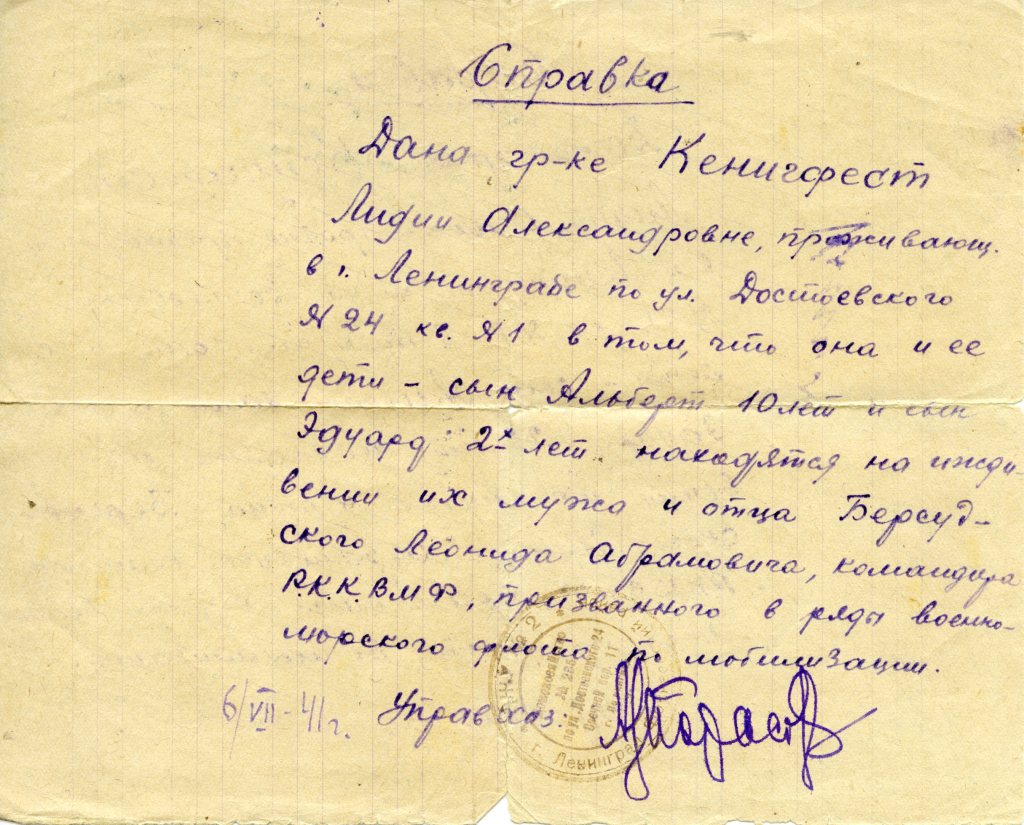 Вряд ли Лидия принимала в одиночку решение отправиться выручать Алика с маленьким Эдом на руках. Судя по письмам, она поддерживала контакт с Леонидом, служившим в Кронштадте. Уже 6-7 июля она обзавелась справкой из ЖАКТа и получила эвакуационное удостоверение на себя и на двух сыновей (без которого она бы не смогла забрать Алика из школы, ставшей детдомом).
