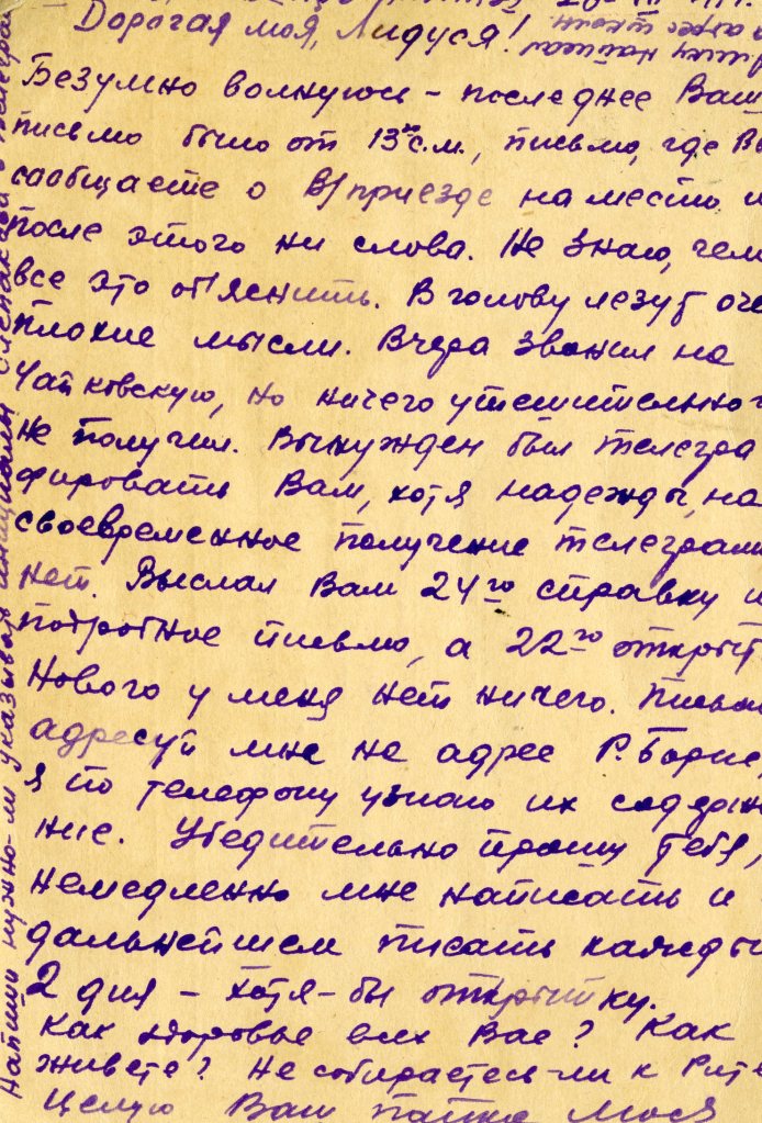 Дорогая моя Лидуся, безумно волнуюсь. Последнее ваше письмо, где вы сообщаете о приезде на место, было 13 сего месяца, и после этого ни слова. Не знаю, чем всё это объяснить. В голову лезут очень плохие мысли.