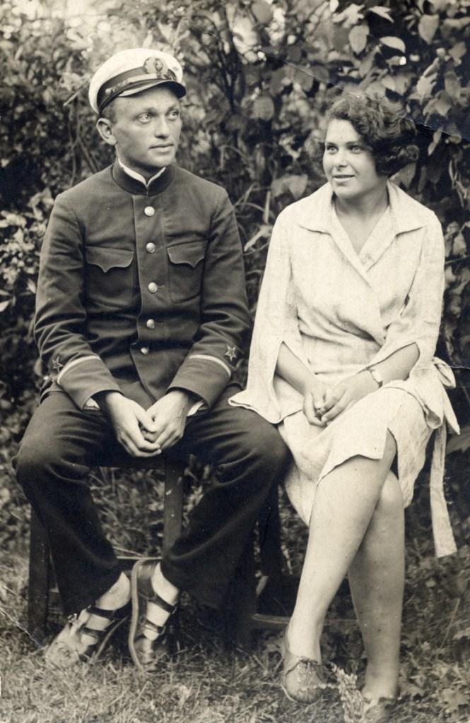 Я посылаю два папиных снимка. На одном он после окончания военно-морского училища, где получил звание лейтенанта. Так как у него был месяц отпуска, он приехал домой. Мы не могли на него наглядеться, таким он был красавцем: шинель до полу и белоснежный китель.