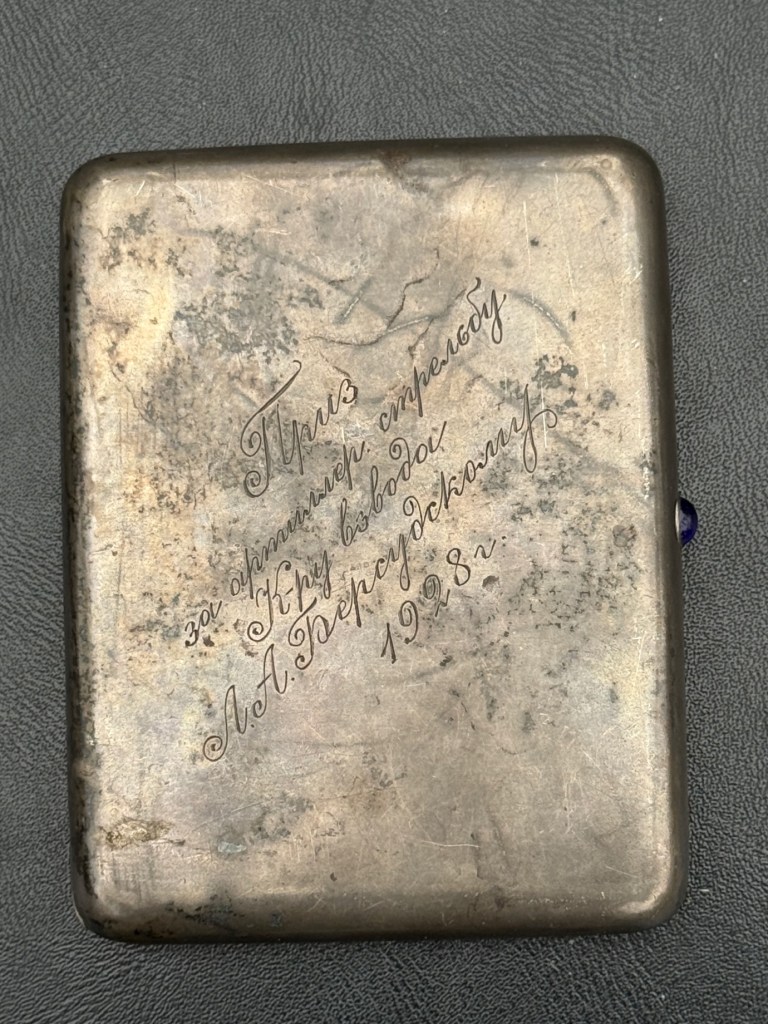 Возможно, это приложение к официальному предложению руки и сердца. 3 декабря 1928-го года их брак зарегистрирован в городе Одессе. В качестве свадебного подарка Леонид дарит Лидии тот самый портсигар – приз за артиллерийскую стрельбу, — сделав на другой его стороне гравировку, состоящую из ее затейливо сплетенных инициалов «Л.К.» и трёх дат «Декабрь 3.13.15». Третье декабря – дата бракосочетания, 15е – день рождение Леонида, а что произошло 13ого – мы не знаем. После свадьбы Лидия переезжает к мужу в форт Красная Горка и устраивается на работу воспитательницей детского сада.