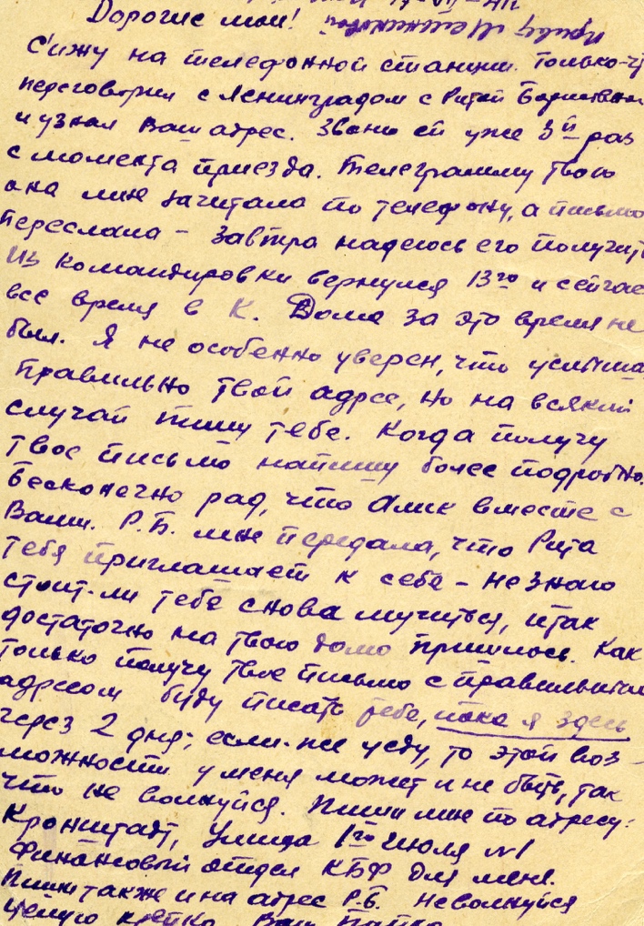 Дорогие мои! Сижу на телефонной станции. Только что переговорил с Ленинградом, с Ритой Борисовной, и узнал ваш адрес. Я не особенно уверен, что услышал правильно твой адрес, но на всякий случай пишу тебе. Бесконечно рад, что Алик вместе с вами. А Рита Борисовна мне передала, что Рита тебя приглашает к себе. Не знаю, стоит ли тебе снова мучиться, и так достаточно на твою долю пришлось. Как только получу твоё письмо с правильным адресом, буду писать тебе, пока я здесь, через 2 дня. Если же уеду, то этой возможности у меня может и не быть, так что не волнуйся. Пиши мне по адресу: Кронштадт, улица 1-го июля, № 1, финансовый отдел КБФ, для меня. Пиши также и на адрес Риты Борисовны. Не волнуйся, целую крепко. Ваш папка.