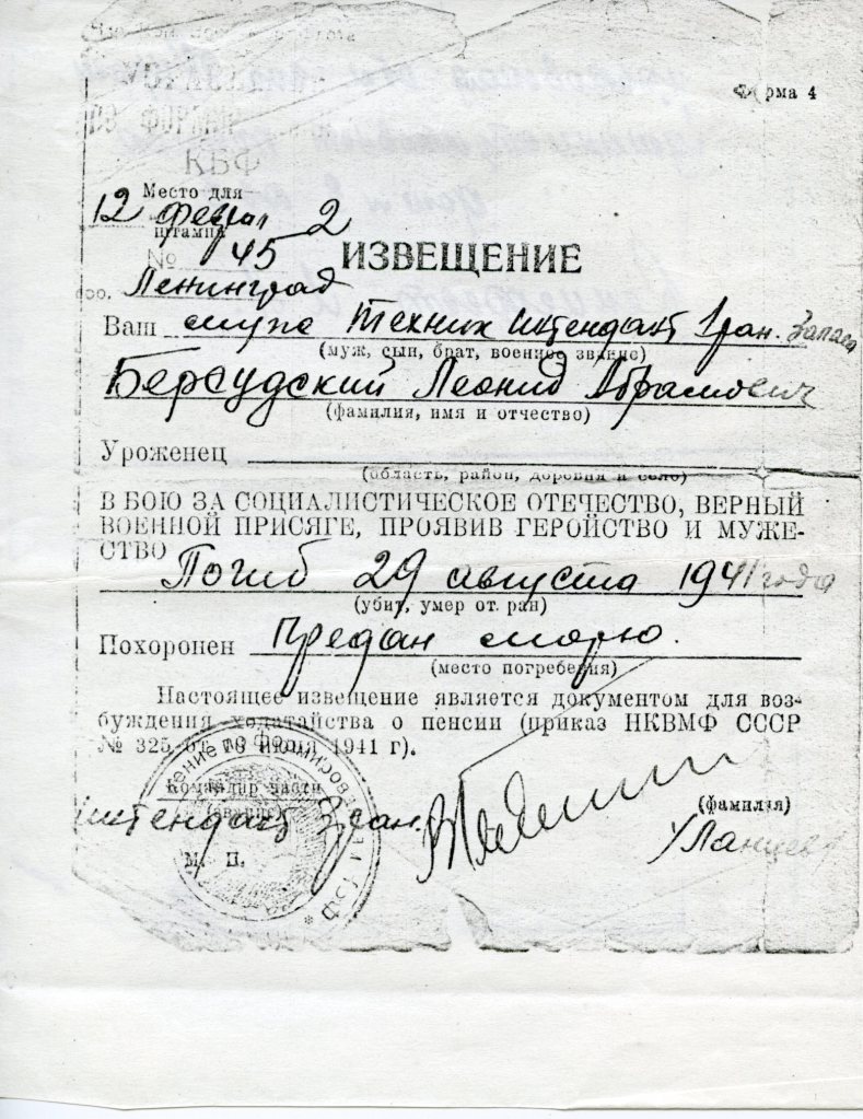 «Техник-интендант 1 ранга БЕРСУДСКИЙ Леонид Абрамович, 1904 годарождения, (место рождения не указано), проходил службу начальником финансовой части штаба береговой обороны Главной базы Балтийского флота ( приказа о назначении в ЦВМА не имеется). Погиб 29 августа 1941 г. в море при перебазировании флота из Таллина в Кронштадт. Личного дела БЕРСУДСКОГО Л.А. на хранении в архиве нет.»