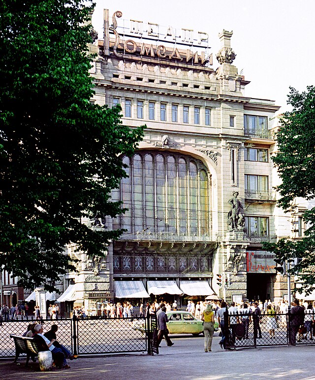 Но любимым стал театр по другую сторону Невского, как раз напротив Александринского, вход в который был зажат между витринами Елисеевского магазина — Театр Комедии, которым руководил Николай Павлович Акимов.