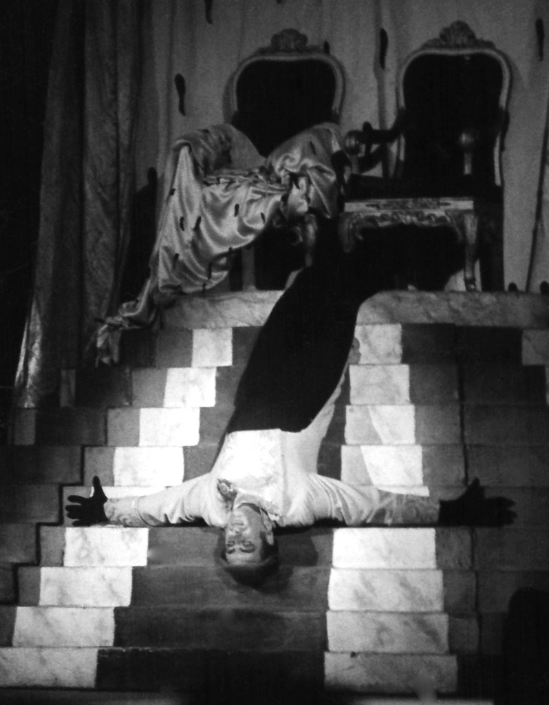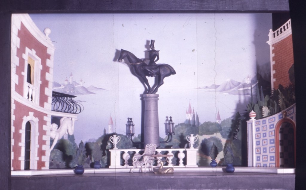 НИНА АЛОВЕРТ: Акимов создал на сцене абсурдный мир сказочного королевства со всеми пороками человеческого общества. Посреди сцены возвышался ехидный парафраз монументов во славу правителей: фигура всадника на лошади вознесена на столп типа Александрийского. Место, естественно, ограничено, и лошадь с трудом удерживается на пятачке в странной позе со сведенными в одну точку ногами.
