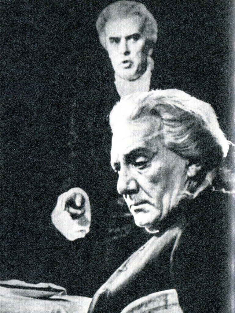Там я видел замечательные спектакли — например, «Бег» Булгакова, где Хлудова играл Николай Черкасов. Такой длинный Черкасов сидел на таком маленьком высоком табурете. Длинный, огромный, ноги расставил… (1) Видел Симонова в роли Сальери. Вдруг объявились свободные места в первом ряду– я сел туда и смотрел на Симонова, открывши рот. Ещё видел «На дне» — там играл тот же Симонов, Толубеев, Фрейндлих… тут была плеяда гениальных актёров…