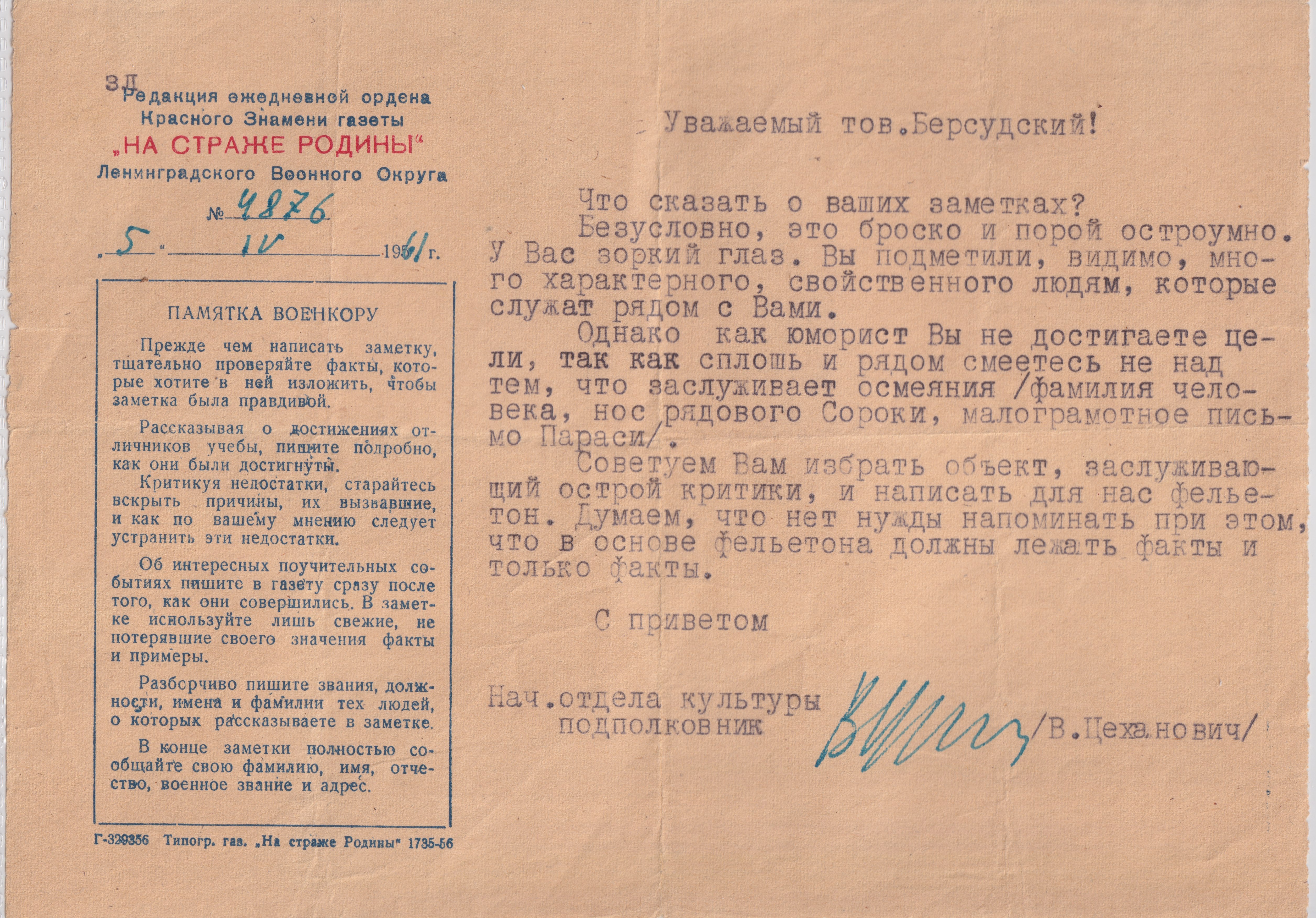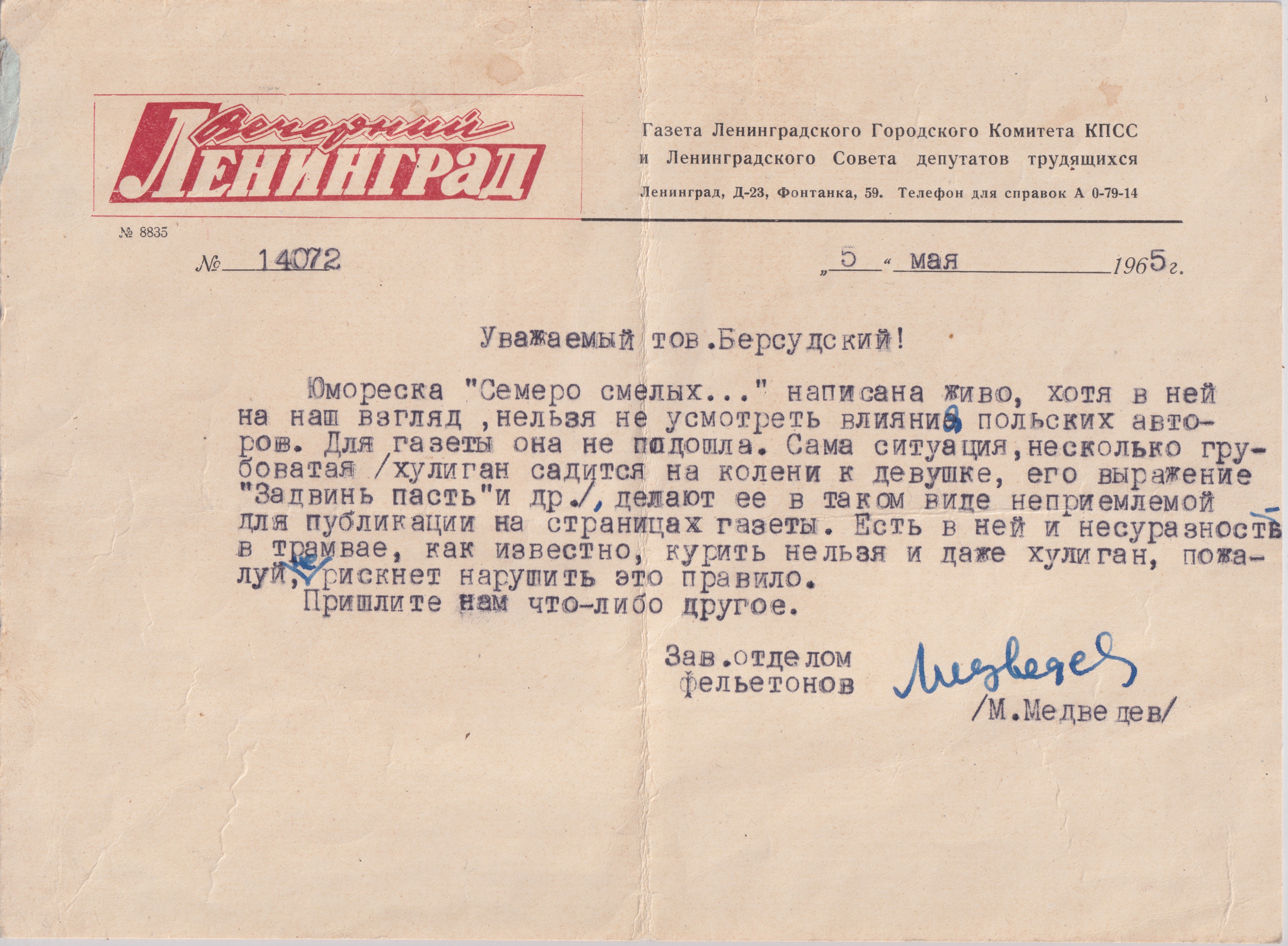 «Безусловно, это броско и порой остроумно. У вас зоркий глаз. Однако как юморист вы не достигаете цели, так как сплошь и рядом смеетесь не над тем, что заслуживает осмеяния…» «Юмореска написана живо, но сама ситуация, несколько грубоватая — хулиган садится на колени к девушке, его выражение «Задвинь пасть» и др., делают ее в таком виде неприемлемой для публикации на страницах газеты…» «На наш взгляд, один из основных недостатков написанного Вами излишне огрубленный юмор… избегайте лобовых, излишне прямолинейных сюжетных ходов, избитых ситуаций. Не огрубляйте , персонажей…«
