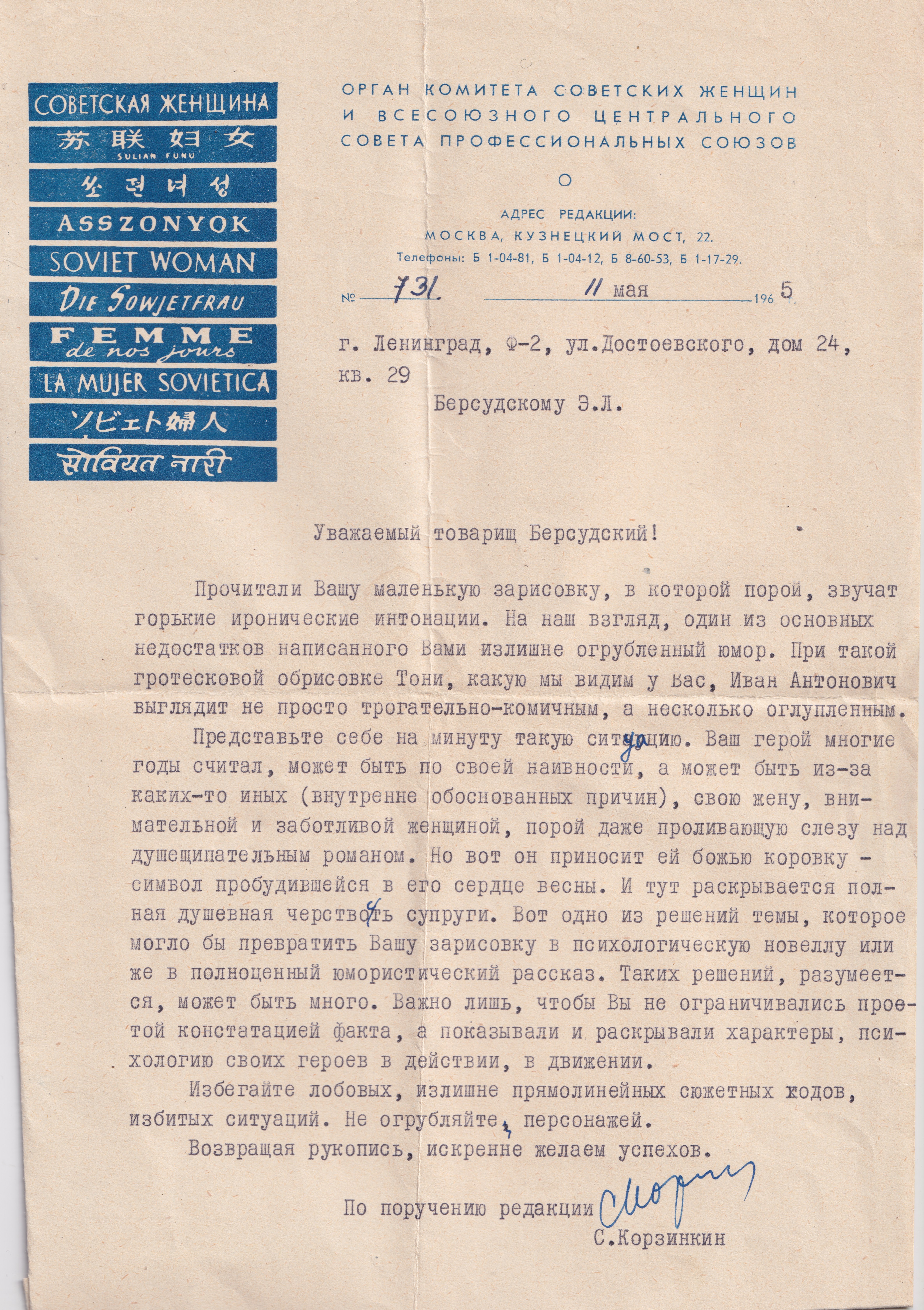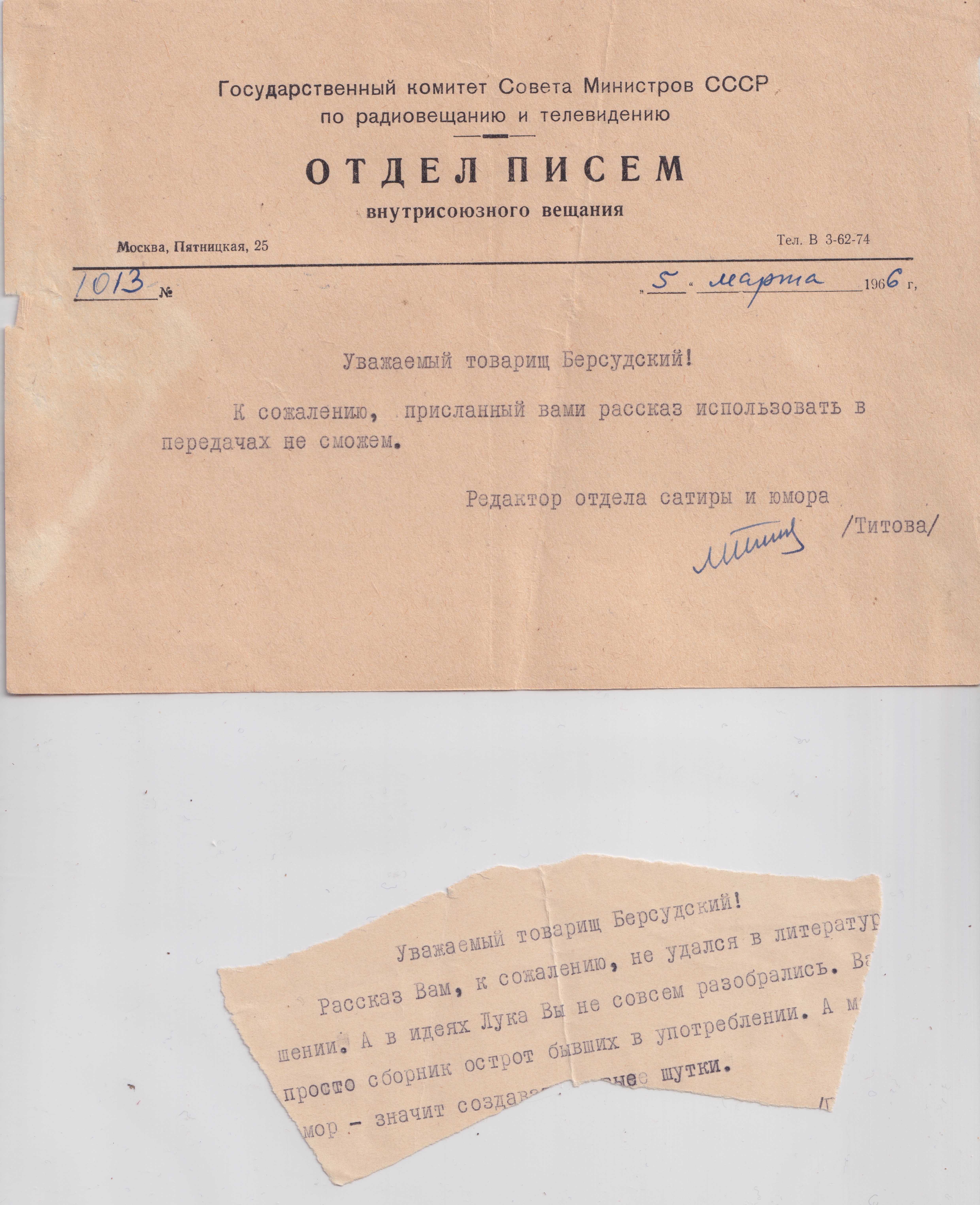 Последнее сохранившееся письма из редакции датируются зимой 1965-66 года. Из рассказов Берсудского не сохранилось ни одного. Возможно, он сжёг их в печке — и решил пойти по другому открывшемуся ему пути.