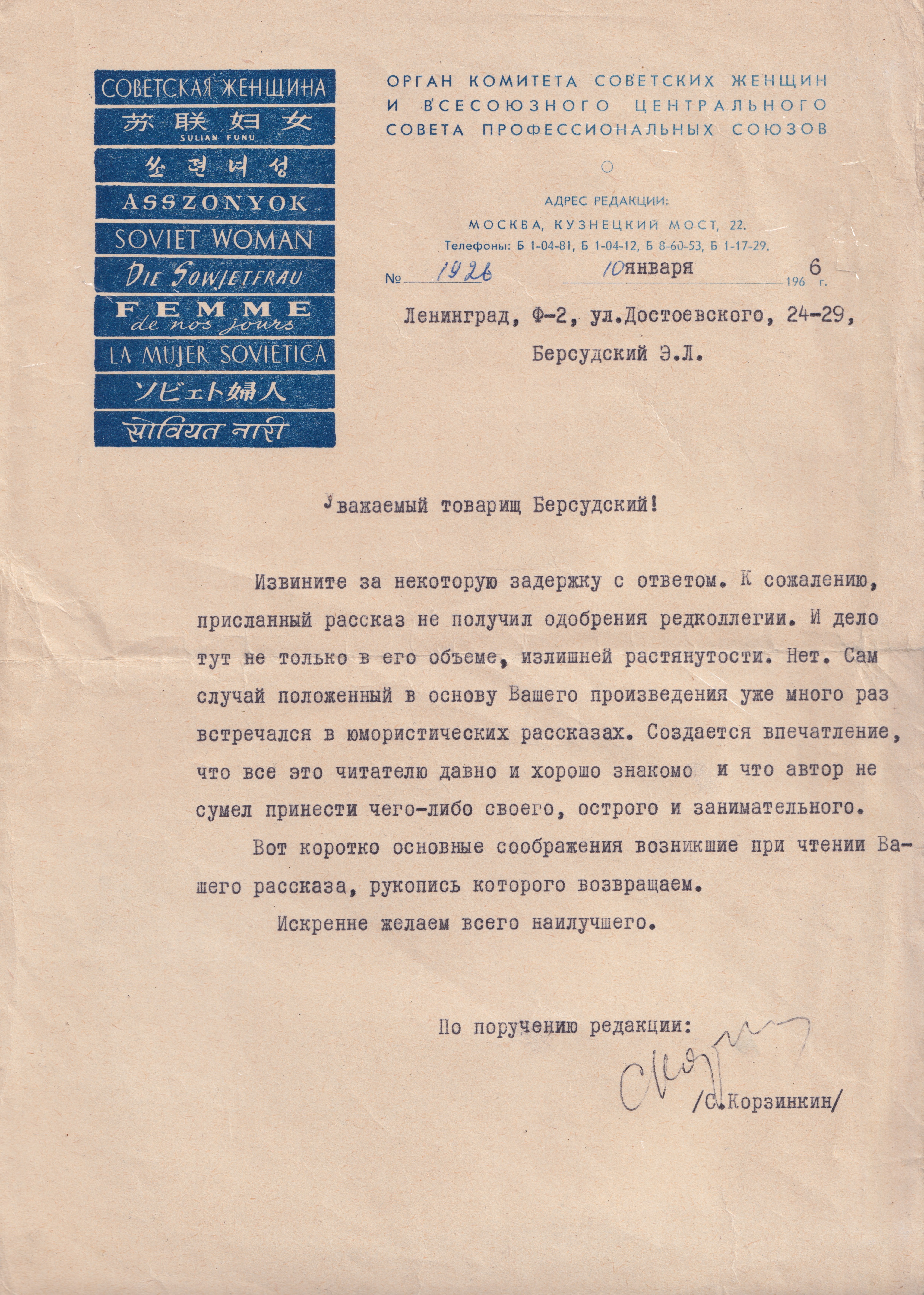 Рассказы Эдуарда Берсудского, которые он в первой половине 1960-х годов рассылал в редакции, не сохранились. Однако сопоставление сохранившихся воркутинских тетрадей с языком редакционных ответов позволяет предположить, что дело было не в частных недостатках текстов, а в более глубоком несовпадении.