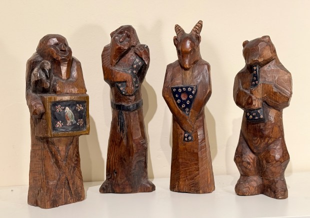 Из этих же сосновых балок Эд вырезал группу музыкантов и ярмарочных скоморохов, в которой смешались звери и люди, и первого своего шарманщика