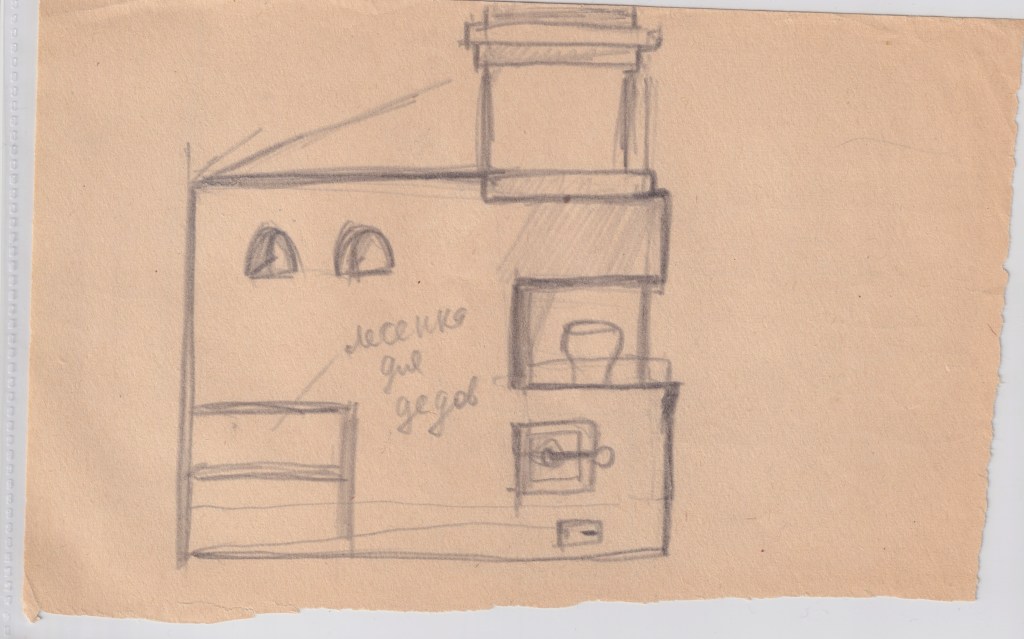 Естественно, изобретатель Берсудский не может пройти мимо технических деталей: железное навершие с петухом прикрывает от дождя и снега трубу («дымник»), на русской печке предусмотрена «лесенка для дедов», чтоб старикам было удобно взбираться на верх.