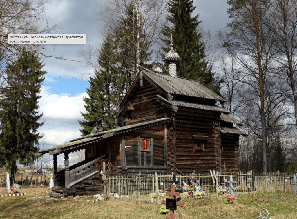 (1) Церковь Рождества Пресвятой Богородицы находится на кладбище в деревне Лиственка Бокситогорского района Ленинградской области. Деревня Лиственка располагается на левом берегу реки Колпь. Численность населения – 34 человека. Располагается у автодороги Ольеши – Сомино, которая выходит на трассу Новая Ладога – Ярославль. По результатам последних исследований (лето 2025) Лиственка «помолодела» — раньше предполагалось, что это древнейший храм на территории Ленобласти был построена в 1599 году, а в 1720 была произведена ее перестройка, к зданию добавились крыльцо и трапезная. Теперь специалисты считают, что здание было построено в 1689 году. Церковь состоит из трёх объёмов: собственно храма, алтарного прируба и трапезной. Кровля церкви и прируба устроена на двойных повалах – расширениях срубов в верхней части. Кровля же трапезной – простая, без вторых выпусков. В алтаре и собственно храме сохранились небольшие волоковые оконца. Старинный облик характеризуется дверным проёмом из храма в трапезную – широкие откосы, по центру – резная верхняя колода с килевидным обрамлением. Во внутреннем убранстве сохранился резной клирос и тябла древнего иконостаса с изображениями святых и надписью.